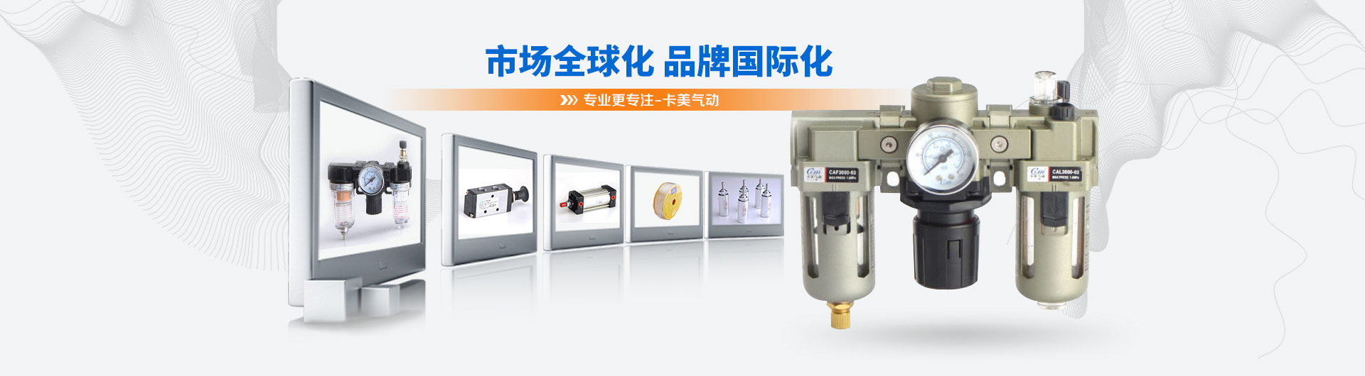 卡美气动有限公司是一家具有现代化生产规模的专业开发、制造气动元件的公司。主导产品有:气源处理系列、标准缸、迷你缸、超薄缸、QGB(大直径)气缸、双轴缸、电磁阀、气动阀、油压缸、快速接头、PU气管等产品。